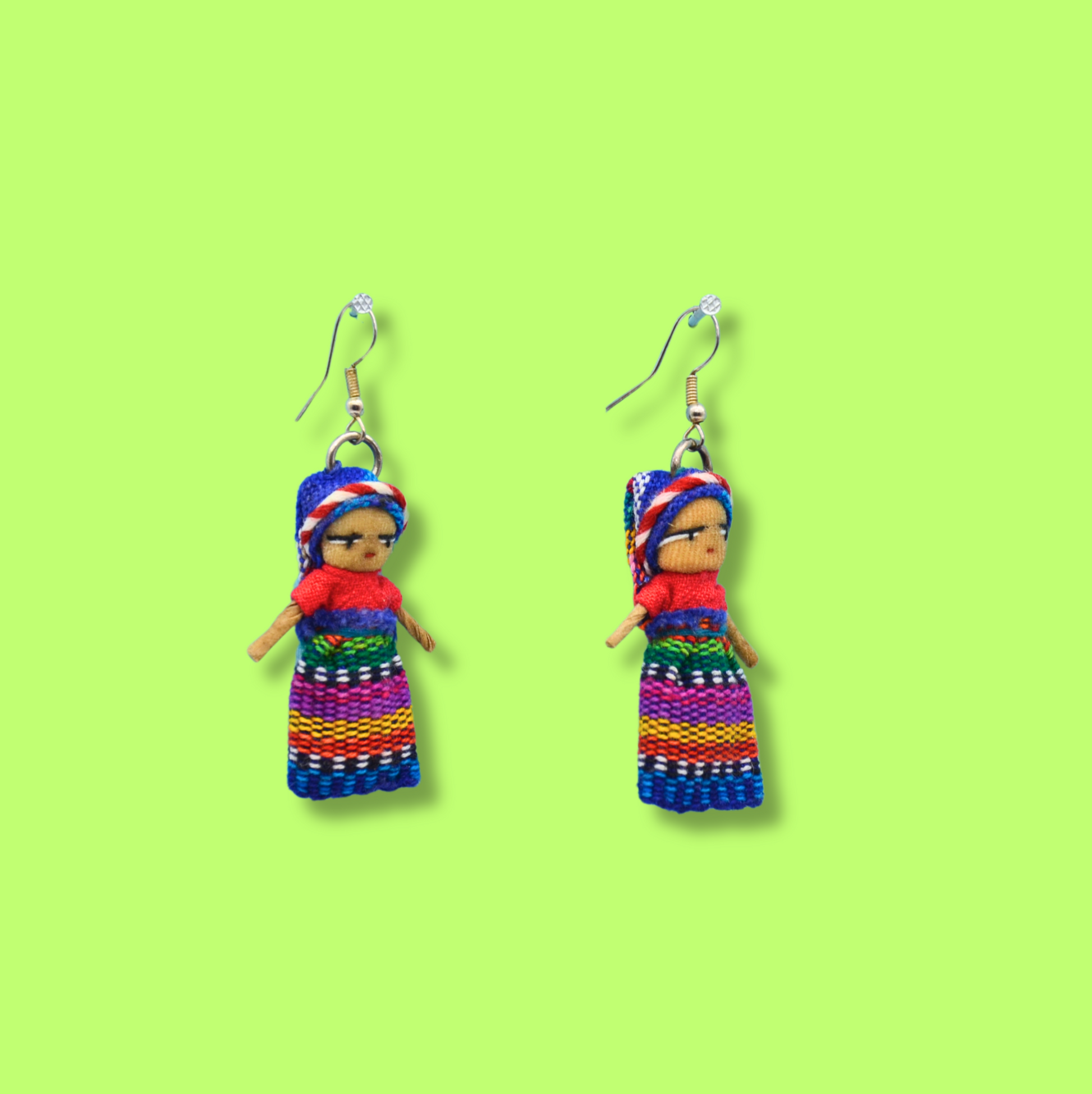 Dessa örhängen är ett par tjejer i tyg, omsorgsfullt återvunna från klassiska leksaker och nu ett par kreativt och hållbara örhängen. Hängena är tillverkade av rostfritt stål, vilket ger en bra hållbarhet och är nickelfria.