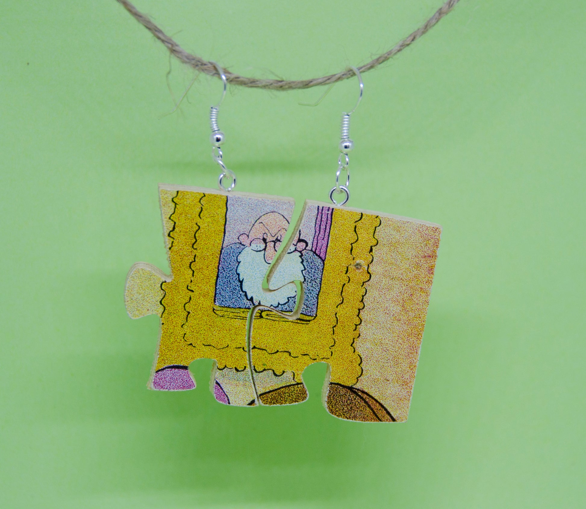 Dessa örhängen är ett par pusselbitar, omsorgsfullt återvunna från klassiska leksaker och nu ett par kreativt och hållbara örhängen. Hängena är tillverkade av rostfritt stål, vilket ger en bra hållbarhet och är nickelfria.