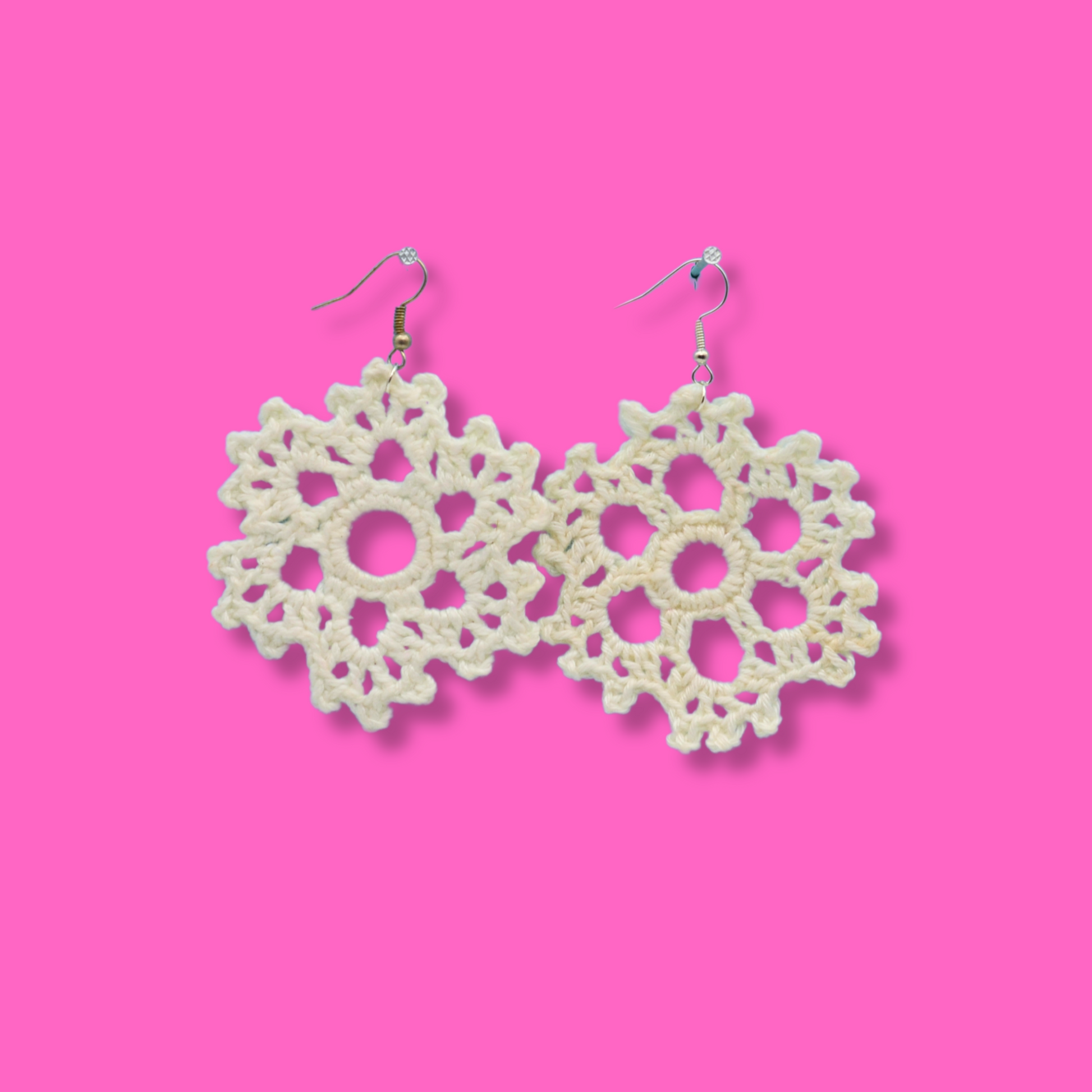 Dessa örhängen som är ett par vita virkade, omsorgsfullt återvunna från klassiska dekorationer och nu ett par kreativt och hållbara örhängen. Hängena är tillverkade av rostfritt stål, vilket ger en bra hållbarhet och är nickelfria.